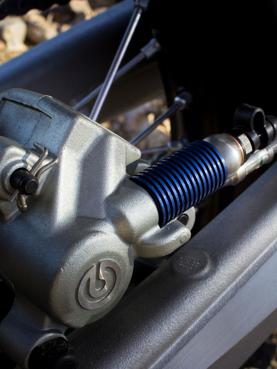 Radiateur d'étrier de frein arrière. Élimine la chaleur accumulée au niveau de l'étrier, du liquide de frein et des plaquettes. Augmente la puissance de freinage et la durée de vie des plaquettes. Réduit l'usure des freins.